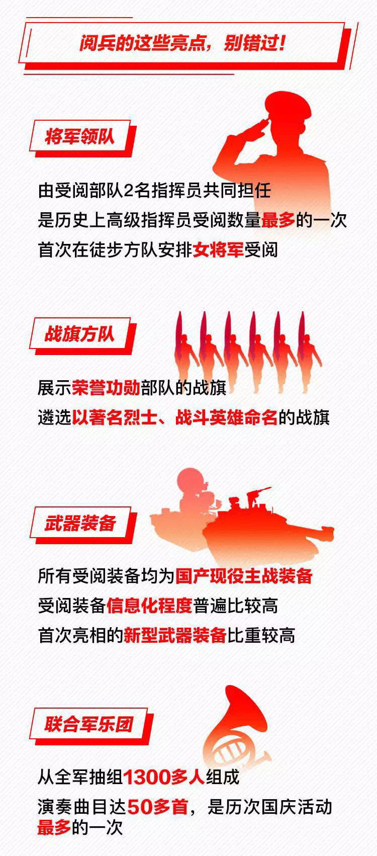 為慶祝新中國成立70周年,10月1日北京天安門廣場將舉行盛大閱兵式。屆時,32個裝備方隊、12個空中梯隊將通過天安門廣場,接受檢閱。此次閱兵,所有受閱裝備均為國產(chǎn)現(xiàn)役主戰(zhàn)裝備,其中包括我軍部分新型裝備,是近幾次閱兵中規(guī)模最大的一次。 強國必須強軍,強軍必須利器。作為我軍機械化、信息化、智能化裝備發(fā)展的骨干,全軍毀傷打擊的核心支撐和現(xiàn)代化新型陸軍體系作戰(zhàn)能力科研制造的主體,此次國慶閱兵式,兵器工業(yè)集團研制生產(chǎn)的16型裝備將接受黨和人民的檢閱,分布在受閱裝備方隊7個模塊中的陸上作戰(zhàn)、防空反導、信息作戰(zhàn)、無人作戰(zhàn)、后裝保障五個模塊、32個方隊中的12個方隊,集中展示了兵器工業(yè)集團履行強軍首責、自主創(chuàng)新的最新成果。 10月1日大閱兵 我們準備好了 |