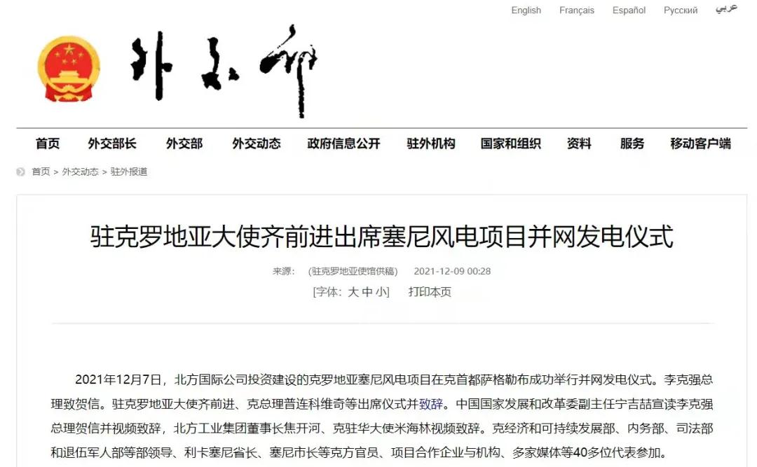 2021年12月7日,中國(guó)兵器工業(yè)集團(tuán)有限公司北方公司所屬北方國(guó)際投資、建設(shè)和運(yùn)營(yíng)的塞尼156MW風(fēng)電項(xiàng)目在克羅地亞首都薩格勒布隆重舉行并網(wǎng)發(fā)電儀式。李克強(qiáng)總理致賀信。克羅地亞總理安德烈·普連科維奇,中國(guó)駐克羅地亞大使齊前進(jìn)出席儀式并致辭。中國(guó)國(guó)家發(fā)展和改革委員會(huì)副主任寧吉喆宣讀李克強(qiáng)總理賀信并視頻致辭,中國(guó)兵器工業(yè)集團(tuán)有限公司董事長(zhǎng)焦開河、克駐華大使米海林視頻致辭。 中華人民共和國(guó)外交部報(bào)道 普連科維奇總理在致辭中表示,感謝李克強(qiáng)總理發(fā)來(lái)賀信,他與中國(guó)領(lǐng)導(dǎo)人一直非常重視塞尼風(fēng)電項(xiàng)目投資與建設(shè)。祝賀項(xiàng)目克服疫情與地震等影響,成功并網(wǎng)發(fā)電。增加清潔可再生能源、綠色電力對(duì)克乃至歐洲都很重要,克政府的重要戰(zhàn)略和目標(biāo)之一就是低碳發(fā)展和增加清潔能源供應(yīng)。塞尼風(fēng)電項(xiàng)目占克總發(fā)電量將達(dá)3.5%,對(duì)克實(shí)現(xiàn)2022年可再生能源比例30%目標(biāo)具有很大幫助。此次投資使北方國(guó)際成為在克最大的清潔能源投資企業(yè)。非常歡迎更多中國(guó)企業(yè)擴(kuò)大對(duì)克投資。 寧吉喆宣讀李克強(qiáng)總理賀信并視頻致辭時(shí)表示,2017年11月第六次中國(guó)—中東歐國(guó)家領(lǐng)導(dǎo)人會(huì)晤期間,在李克強(qiáng)總理和普連科維奇總理等中東歐16國(guó)領(lǐng)導(dǎo)人的共同見證下,塞尼項(xiàng)目簽署了協(xié)議。項(xiàng)目既是中國(guó)堅(jiān)定踐行綠色發(fā)展理念的具體體現(xiàn),也是中國(guó)深化與克羅地亞、與中東歐國(guó)家務(wù)實(shí)合作的生動(dòng)實(shí)踐。希望中克兩國(guó)政府部門,企業(yè)等有關(guān)各方共同努力、相互配合,運(yùn)營(yíng)好塞尼項(xiàng)目,打造出中歐綠色合作的樣板,帶動(dòng)兩國(guó)務(wù)實(shí)合作持續(xù)深入發(fā)展,造福兩國(guó)人民。