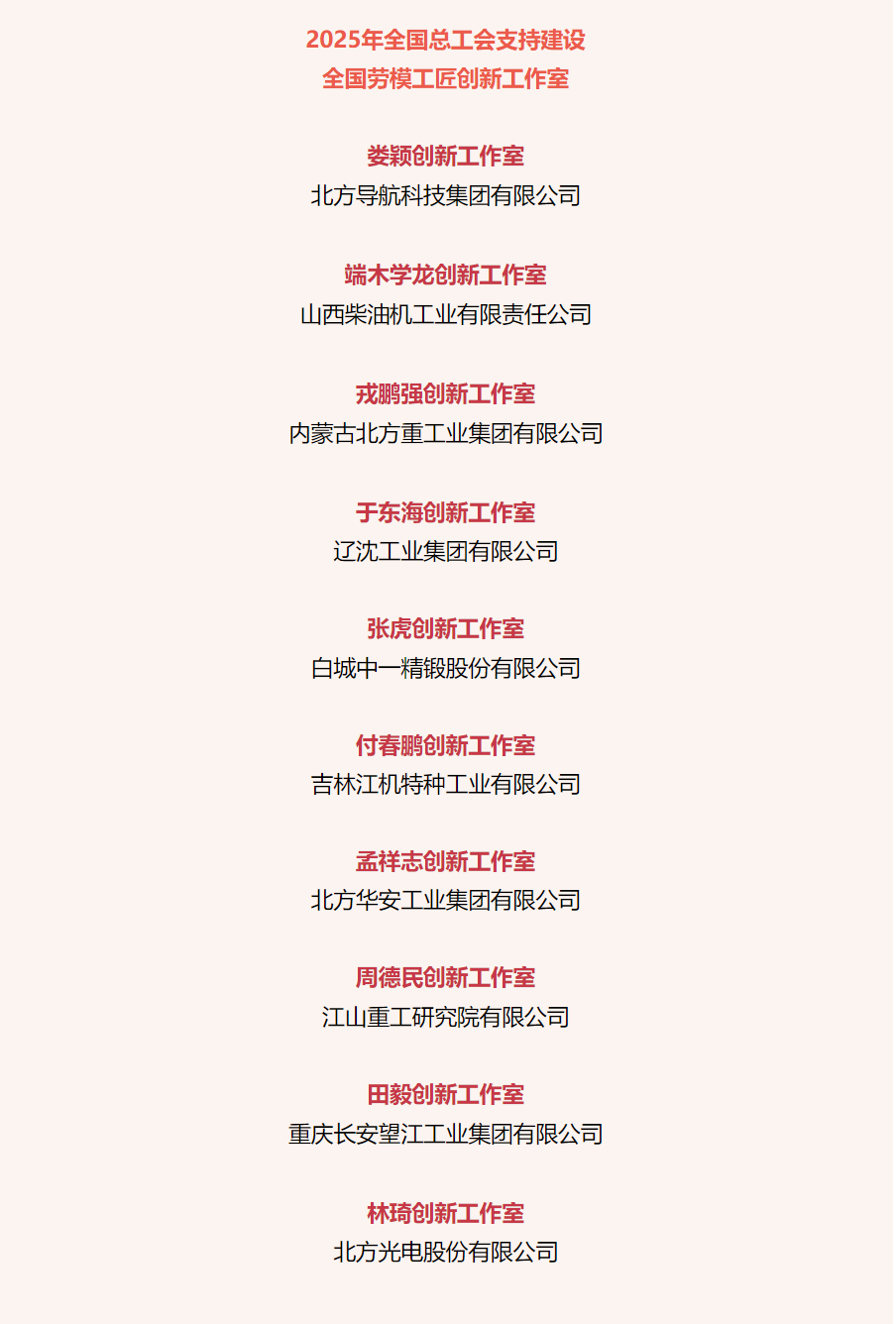 近日,中華全國總工會公布2025年全國總工會支持建設(shè)全國勞模工匠創(chuàng)新工作室名單,兵器工業(yè)集團(tuán)10個勞模工匠創(chuàng)新工作室獲全國總工會支持建設(shè)。